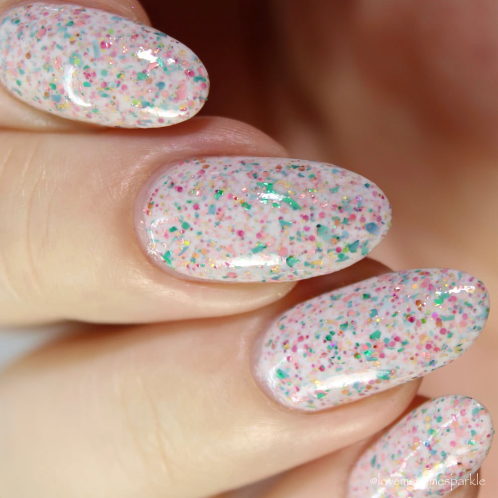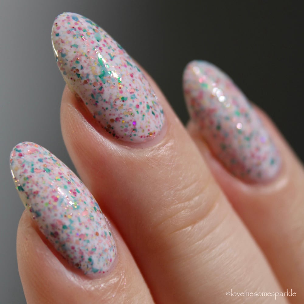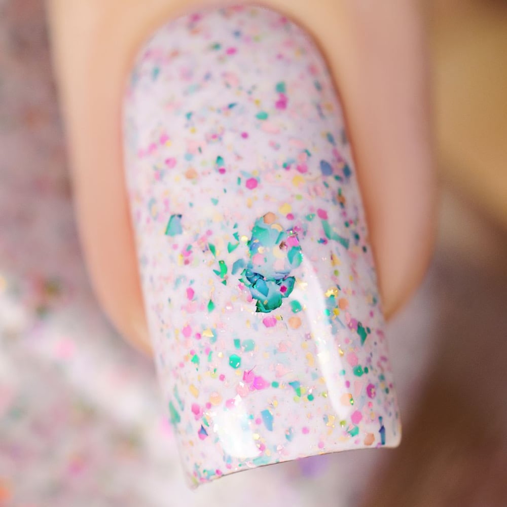 This shade features pink, gold and emerald metallic flakies as well as holo pink, bright holo pink, gold, copper, holo lime and emerald metallic glitters in a white crelly base! ๐๐๐