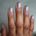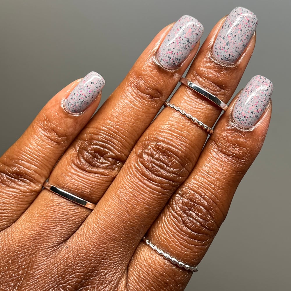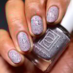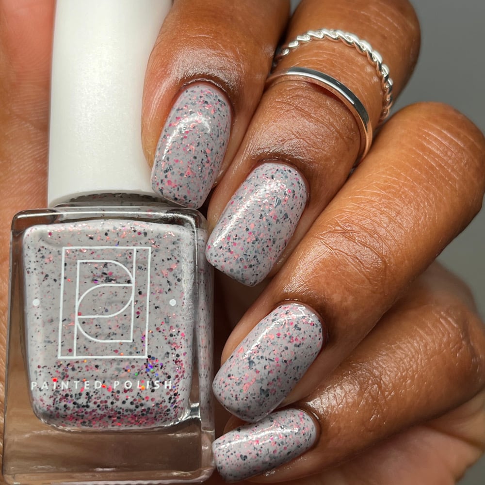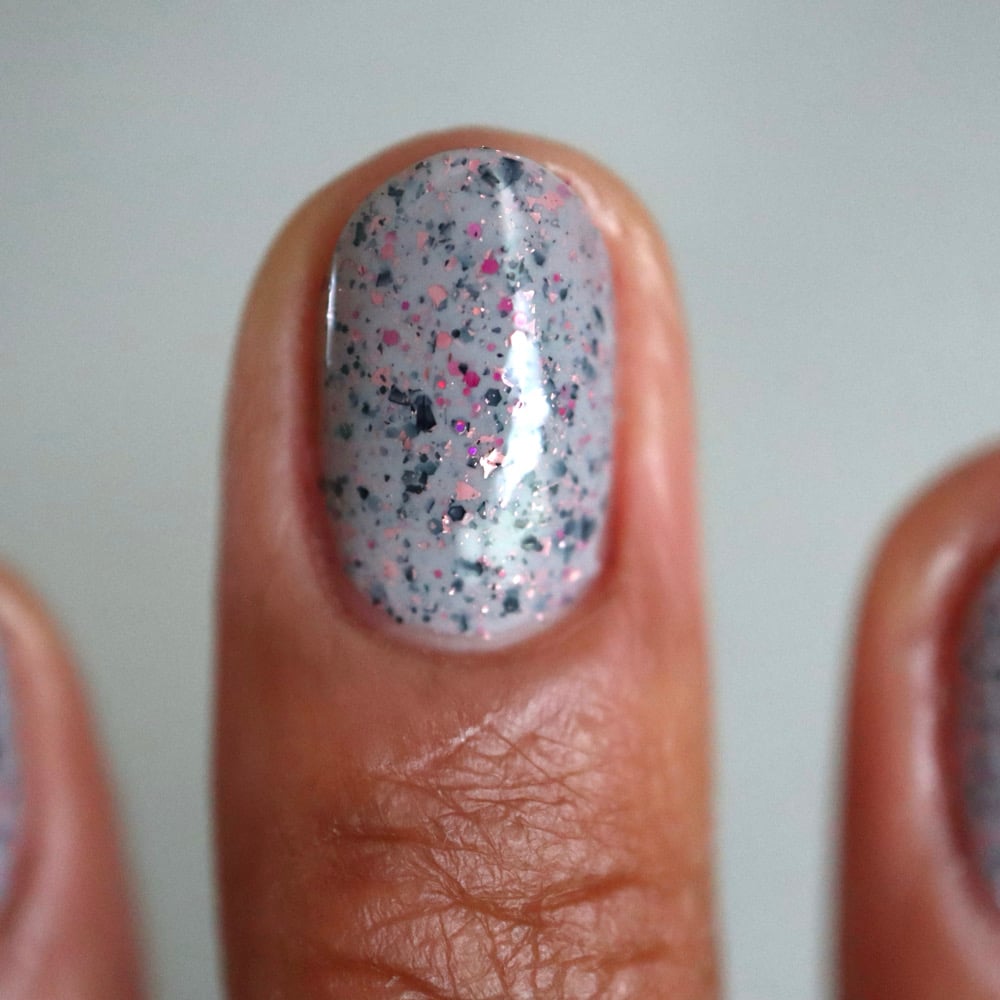This polish features black and light pink metallic flakies and a variety of pink metallic glitters in an ash grey crelly base! π©·