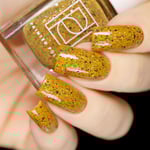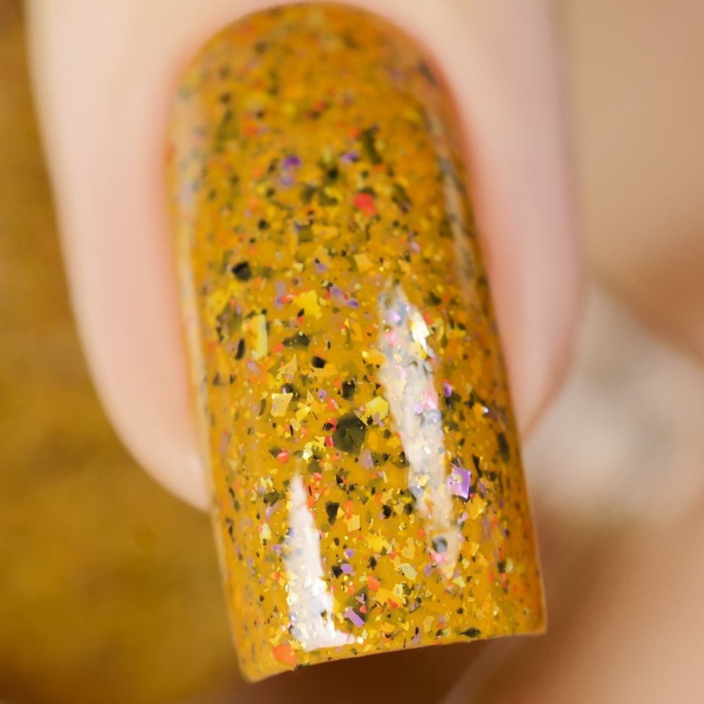 This shade features red, purple, silver and black metallic flakies in a harvest gold crelly base! π
