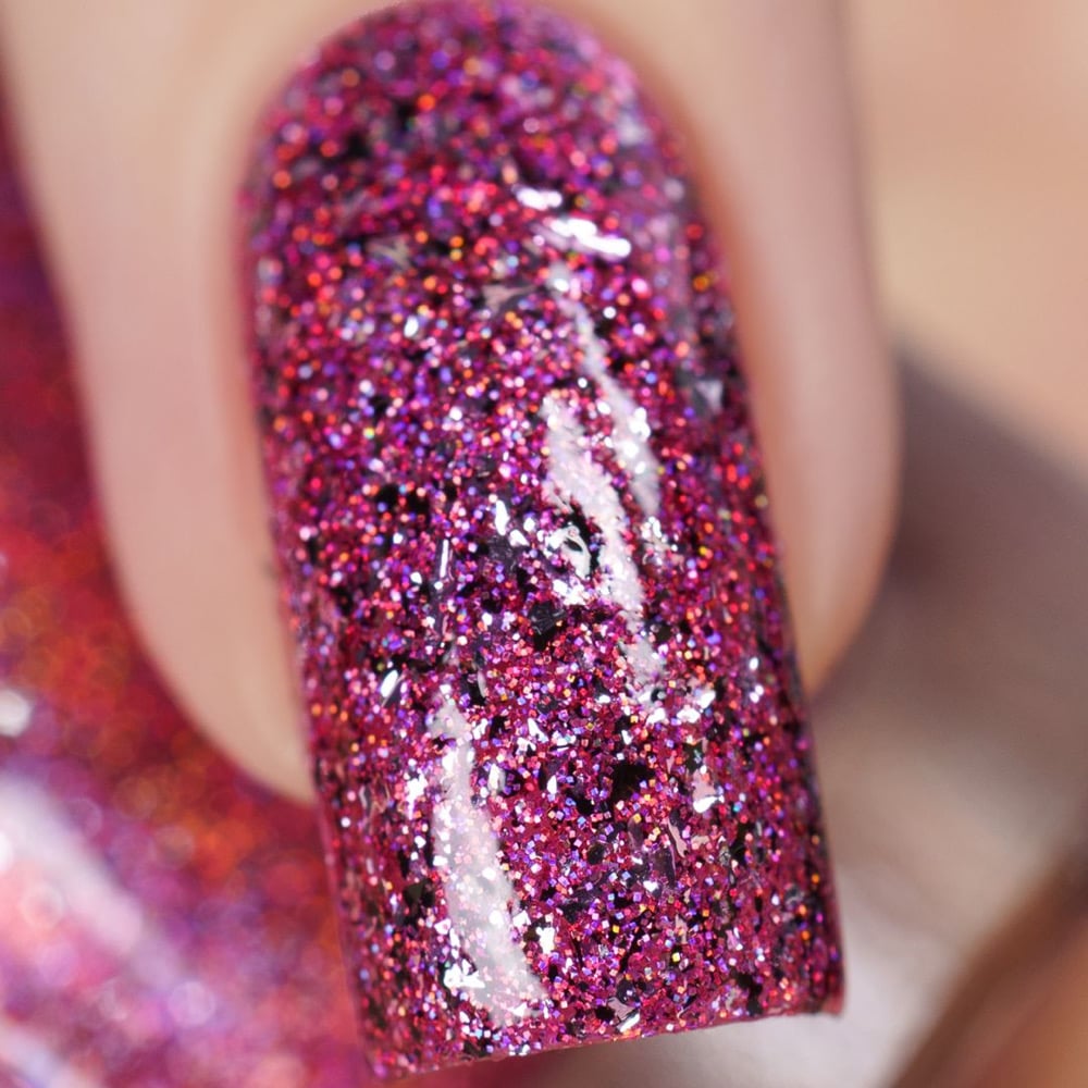 This beautifully blinding shade features ultra holographic pink glitter as well as black and silver metallic flakies in a bright pink jelly base! π