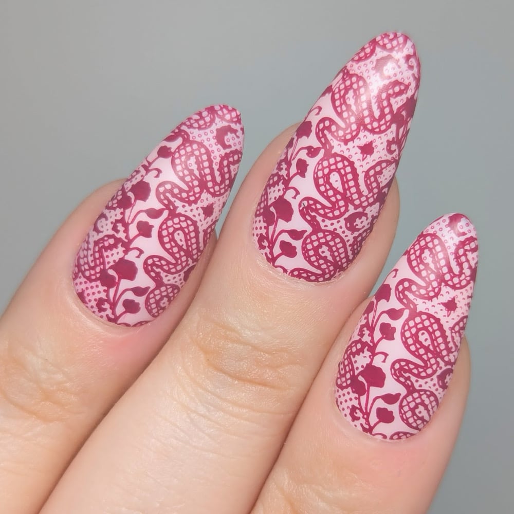 Stamped in Love is a one-coat maroon creme that doubles as a stamping polish! It’s completely opaque over black and white and every shade in between!