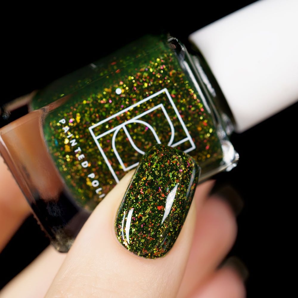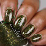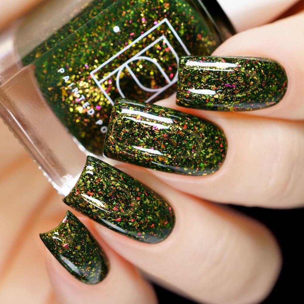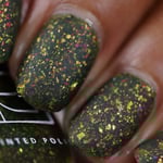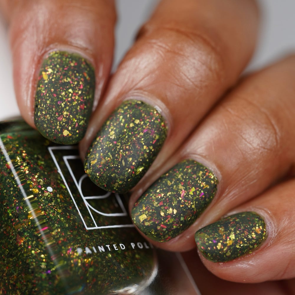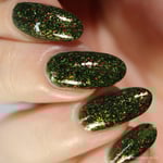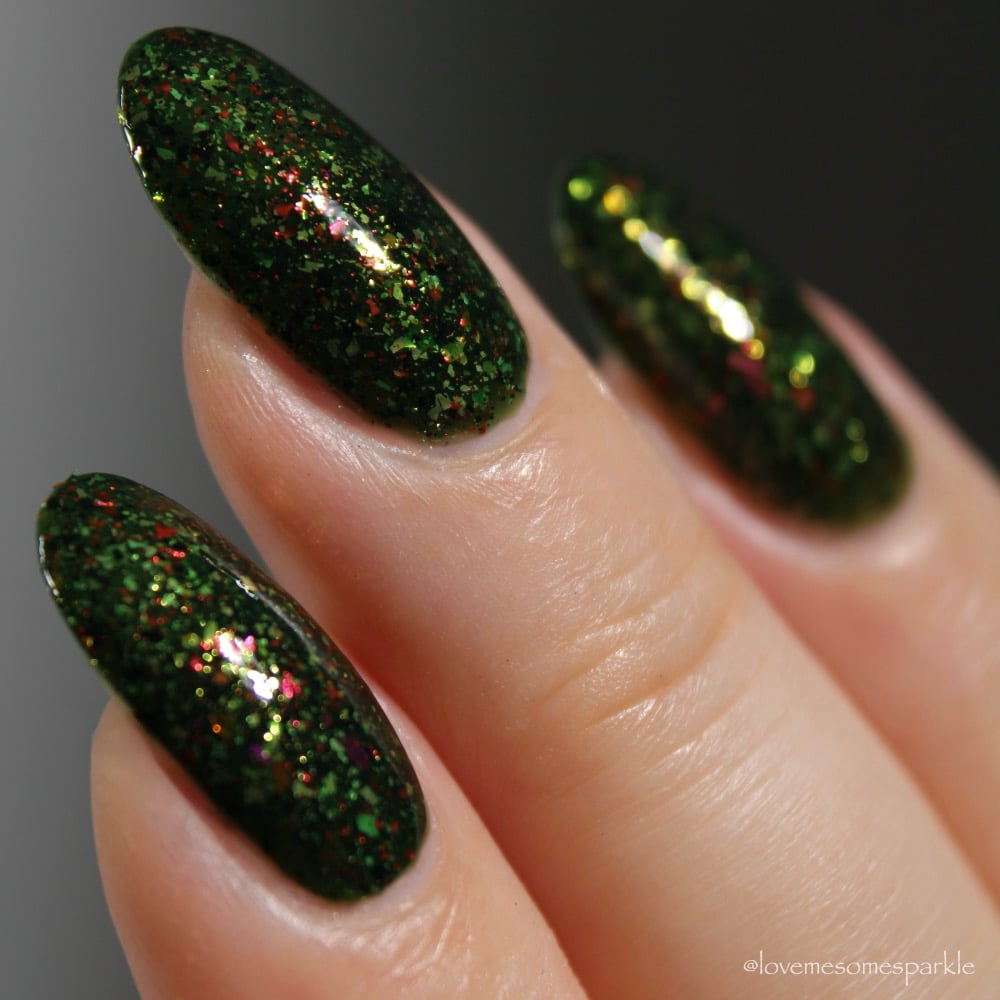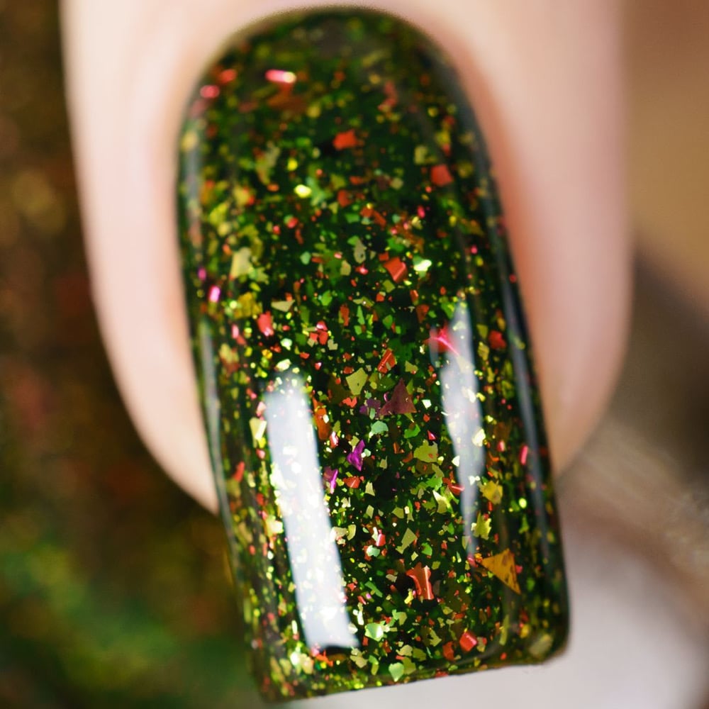 This shade features pink-orange color-shifting iridescent flakies as well as red, black and gold metallic flakies in a deep jungle green jelly base! 💚